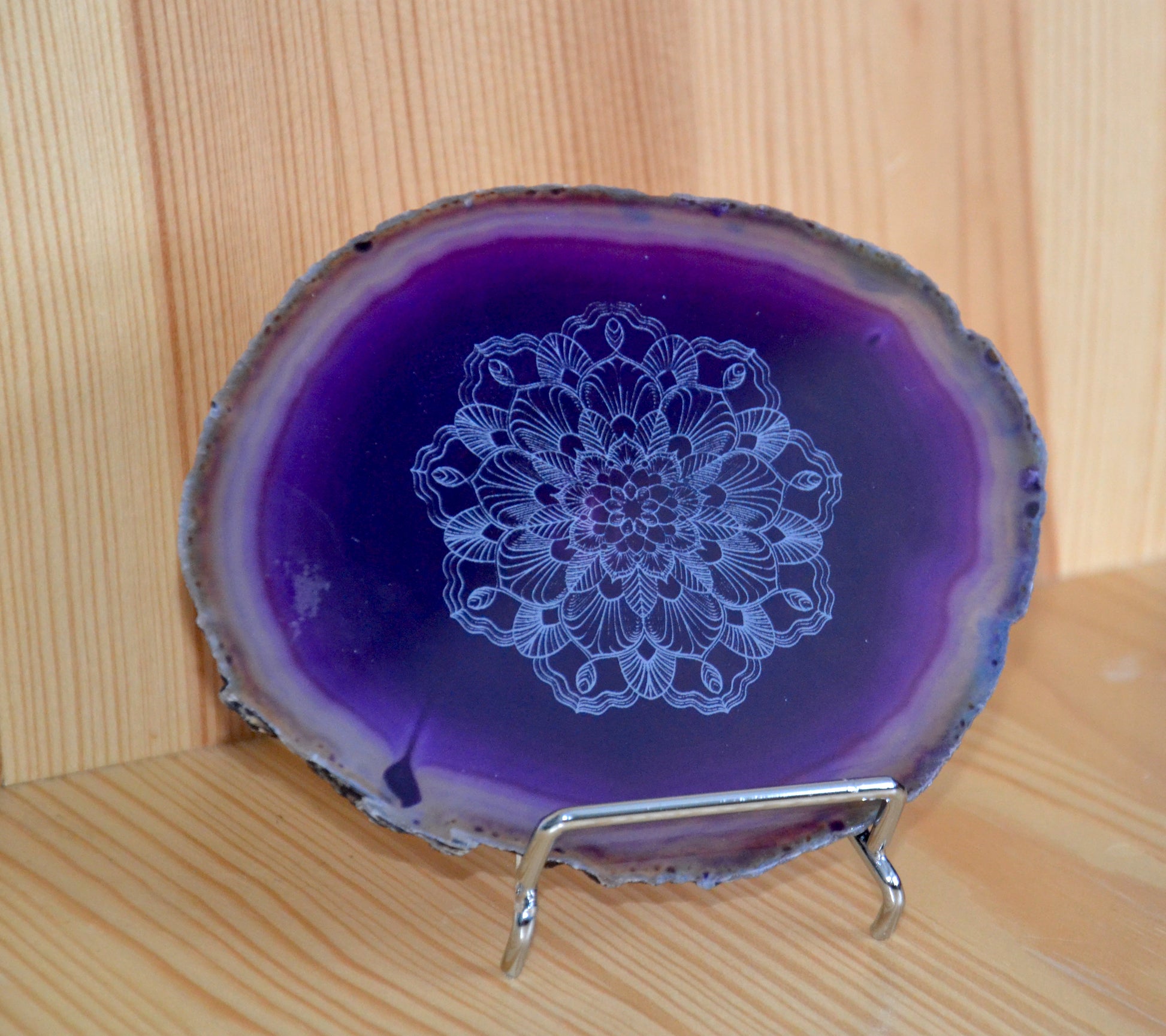 Krásny gravírovaný farbený achát s motívom mandaly je vhodný ako pekný bytový doplnok alebo ako podšálka.