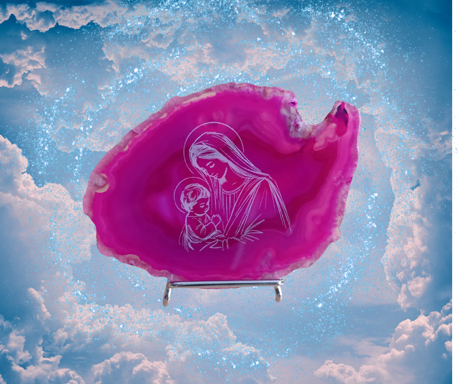 Krásny gravírovaný prírodný farbený achát s motívom Panny Márie a Ježiška.