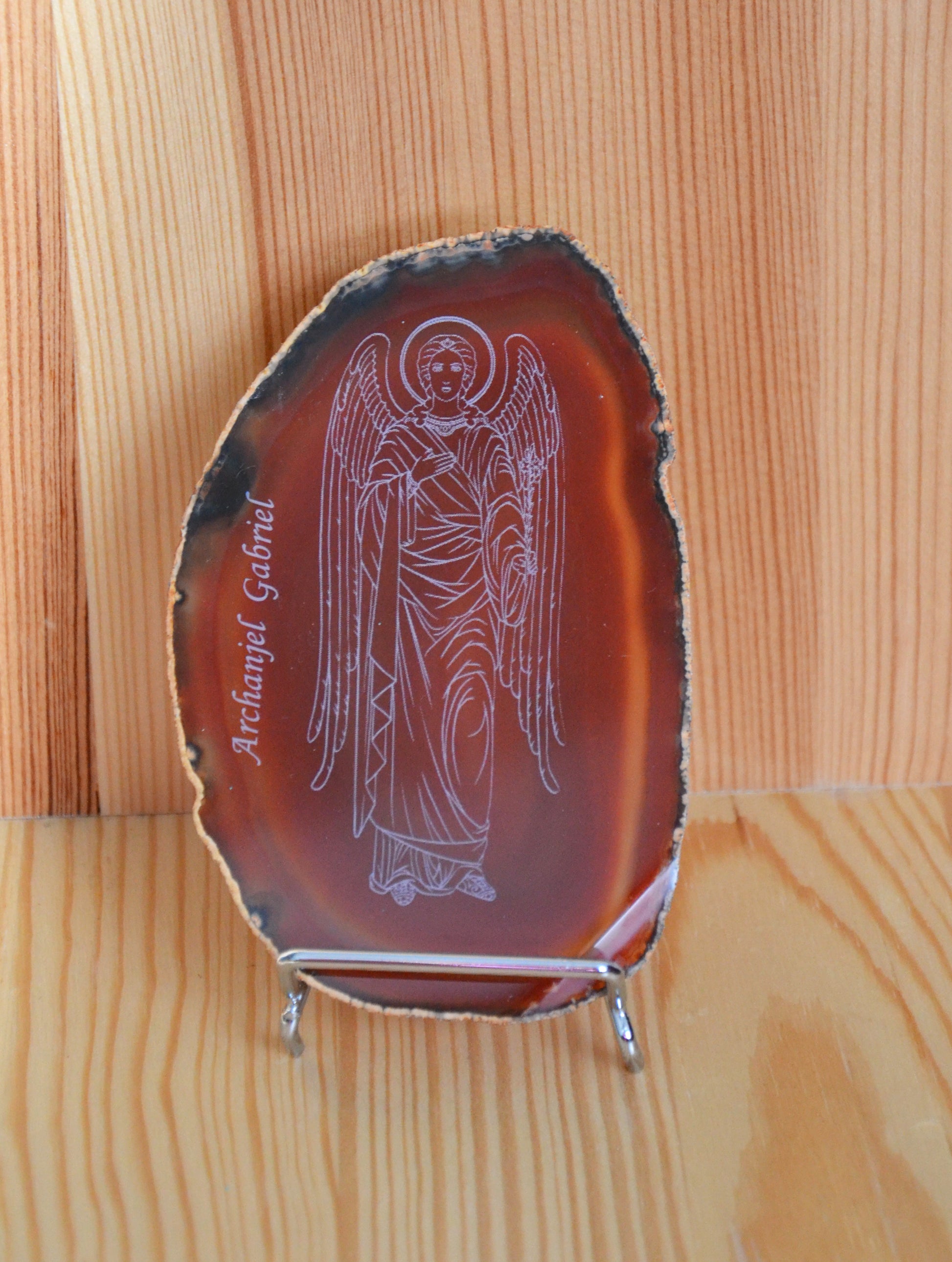 Gravírovaný brazílsky achát: Tento nádherný prírodný kameň je starostlivo vygravírovaný s detailným motívom archanjela Gabriela. Brazílsky achát je známy svojimi liečivými vlastnosťami a schopnosťou stabilizovať energetické pole.