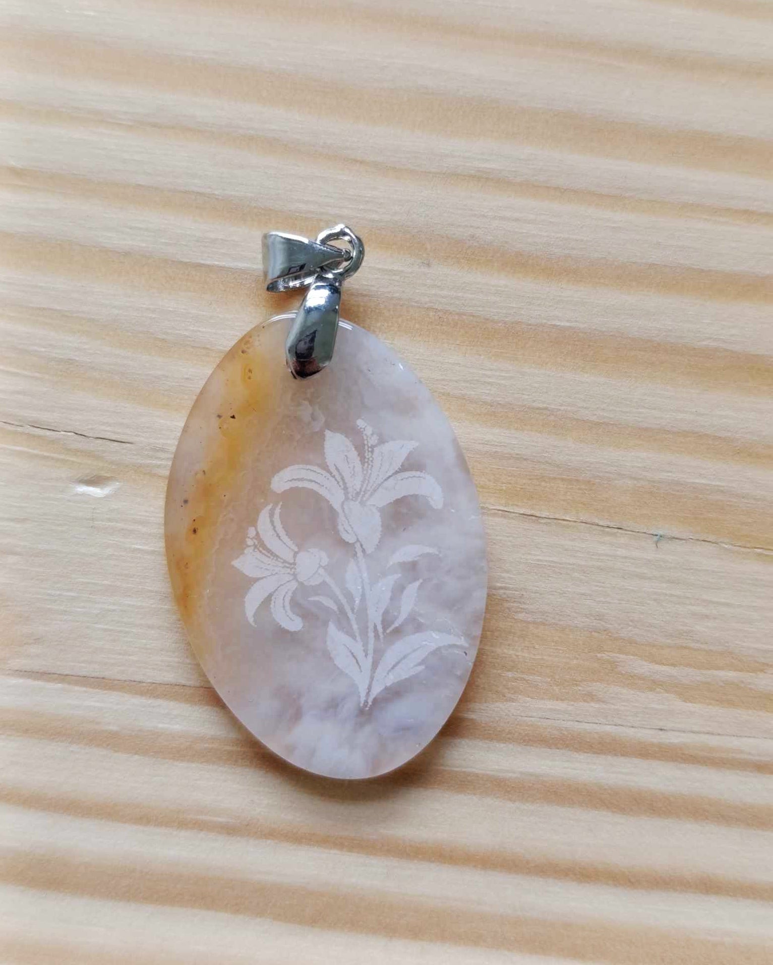 Gravírovaný prívesok z achátu s motívom ľalie: Ľalia je symbolom čistoty, duchovného rastu a nebeskej ochrany, čo robí tento prívesok dokonalým doplnkom k téme archanjela Gabriela. Archanjel Gabriel je znázorňovaný s kvetom ľalie v ruke. Kameň je jemne gravírovaný, čo mu dodáva elegantný a sofistikovaný vzhľad.