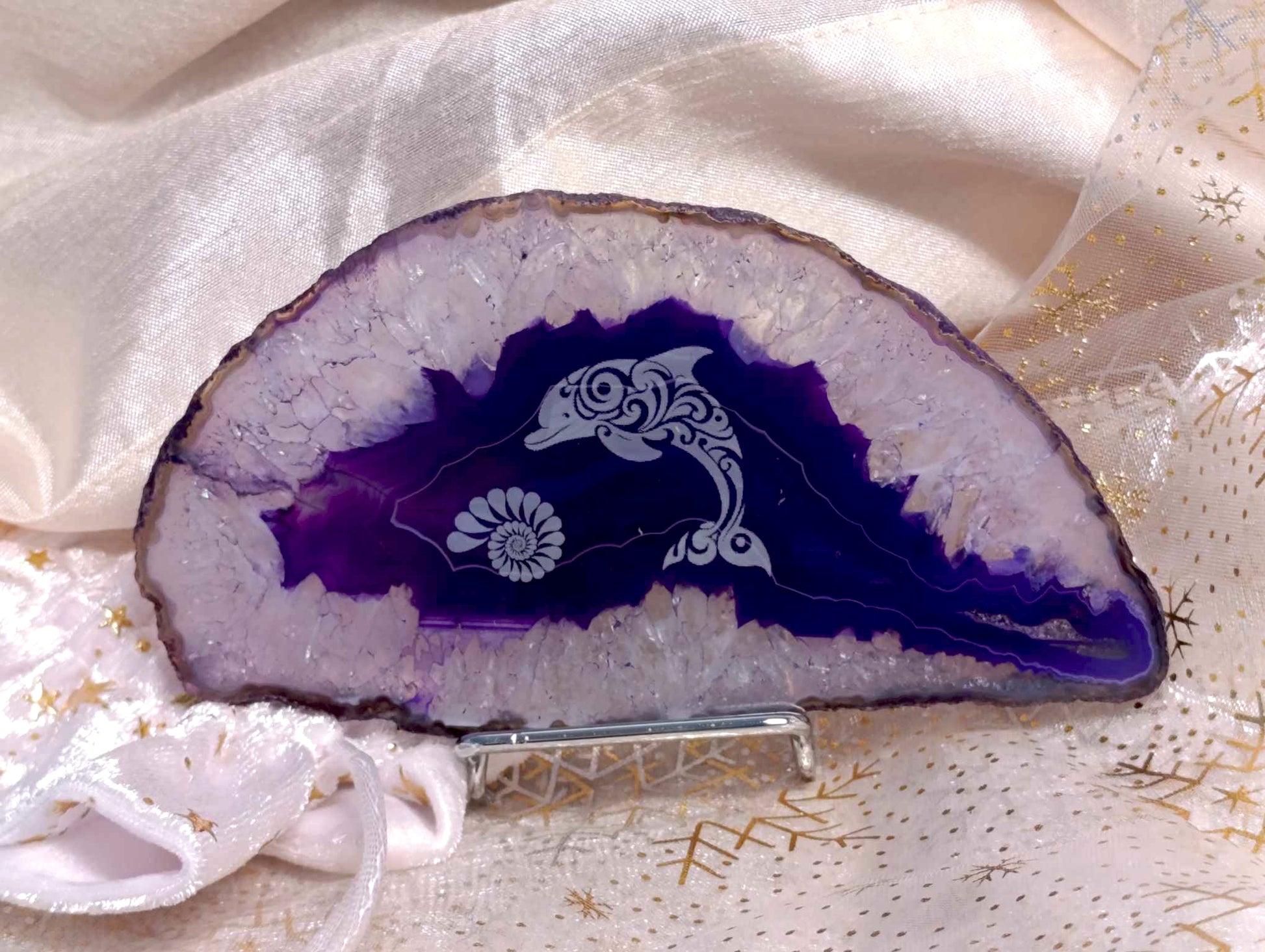 Centrom achátového plátku je detailne gravírovaný motív skákajúceho delfína. Delfín je symbolom: