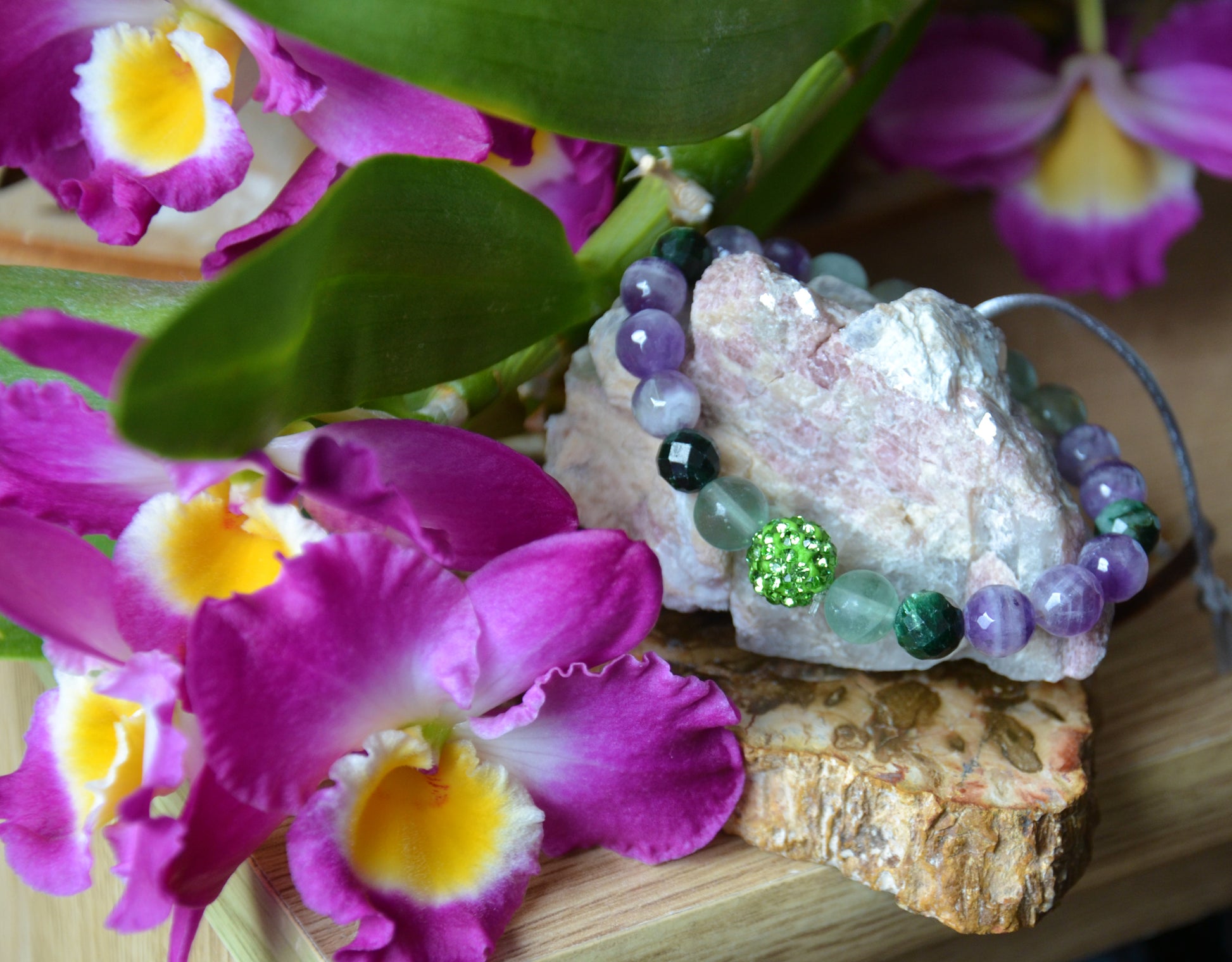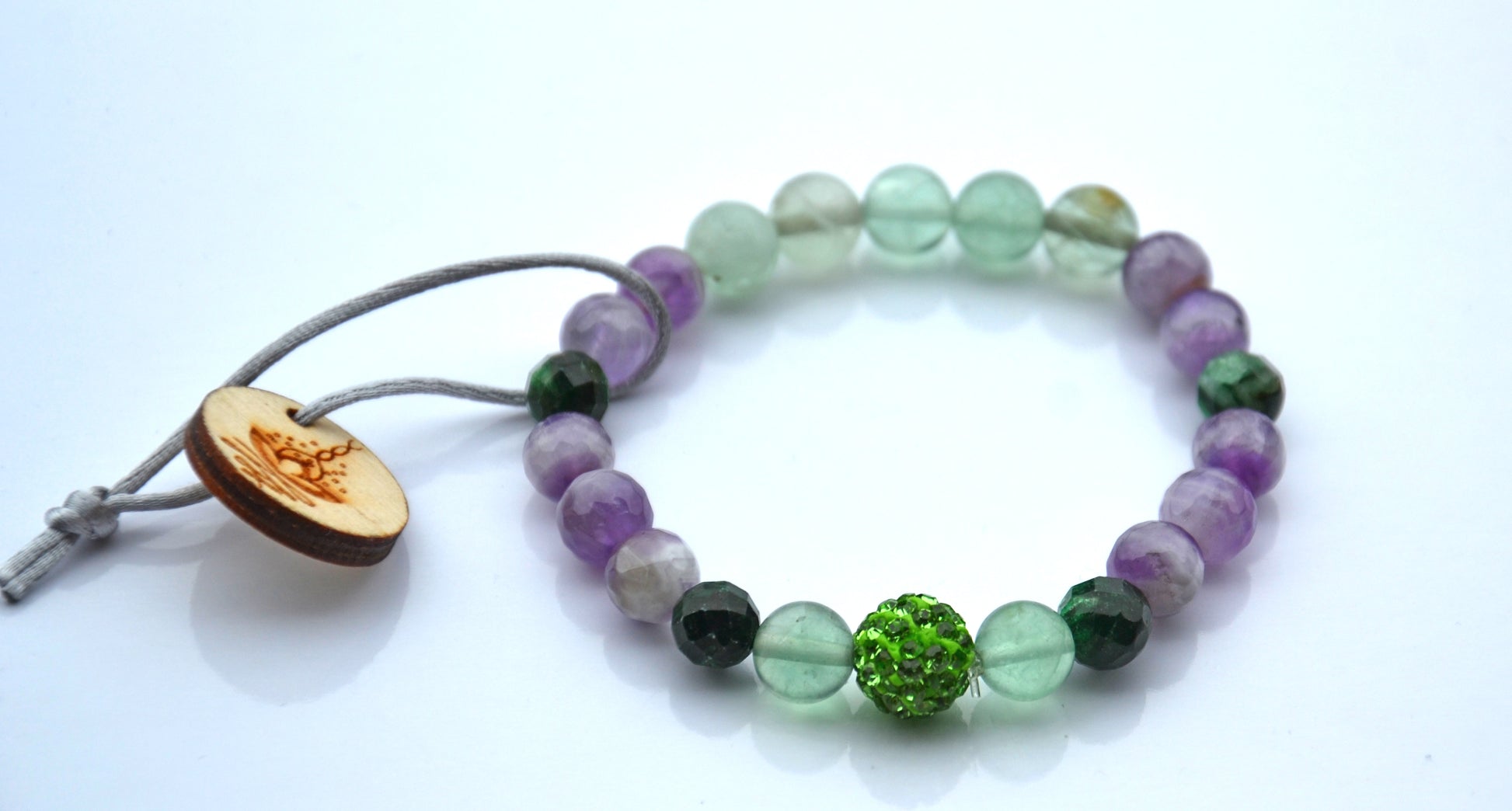 Veľmi jemný a harmonický náramok je tvorený z kamienkov prírodného ametystu, fluoritu a smaragdu.