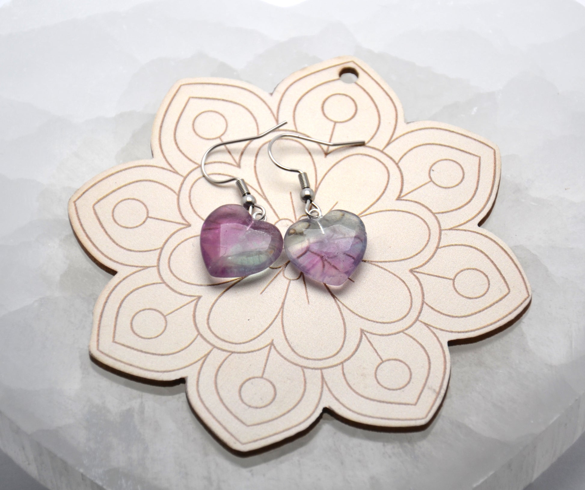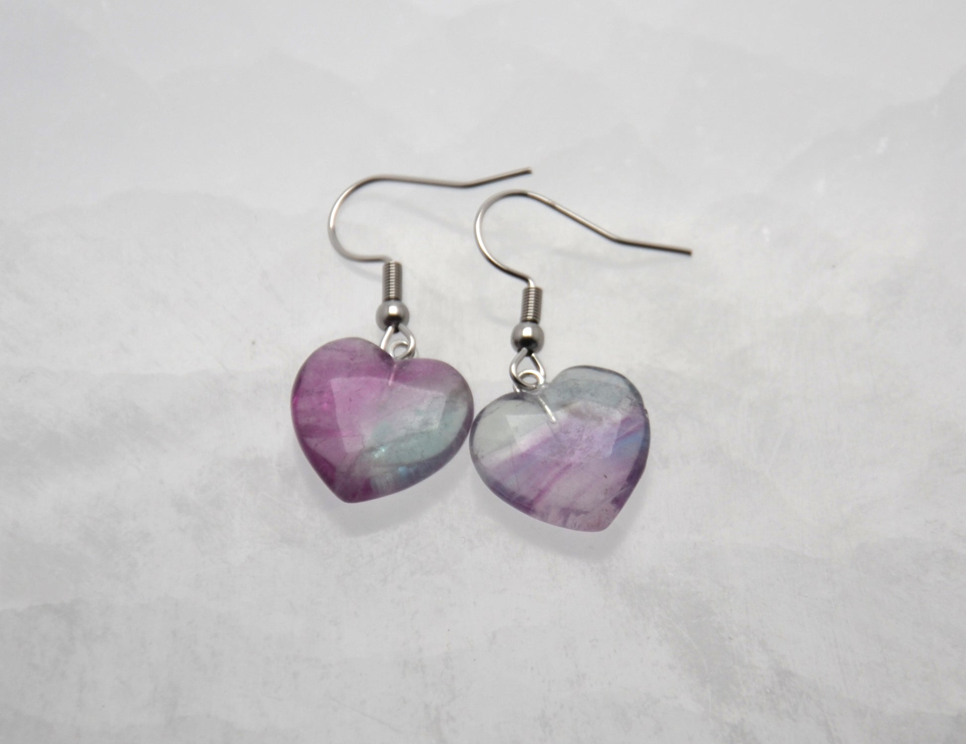 Jemné náušnice, v tvare srdca, sú nádherným doplnkom pre všedné aj nevšedné dni. Tvorí ich srdce z prírodného fluoritu a háčik z chirurgickej ocele.