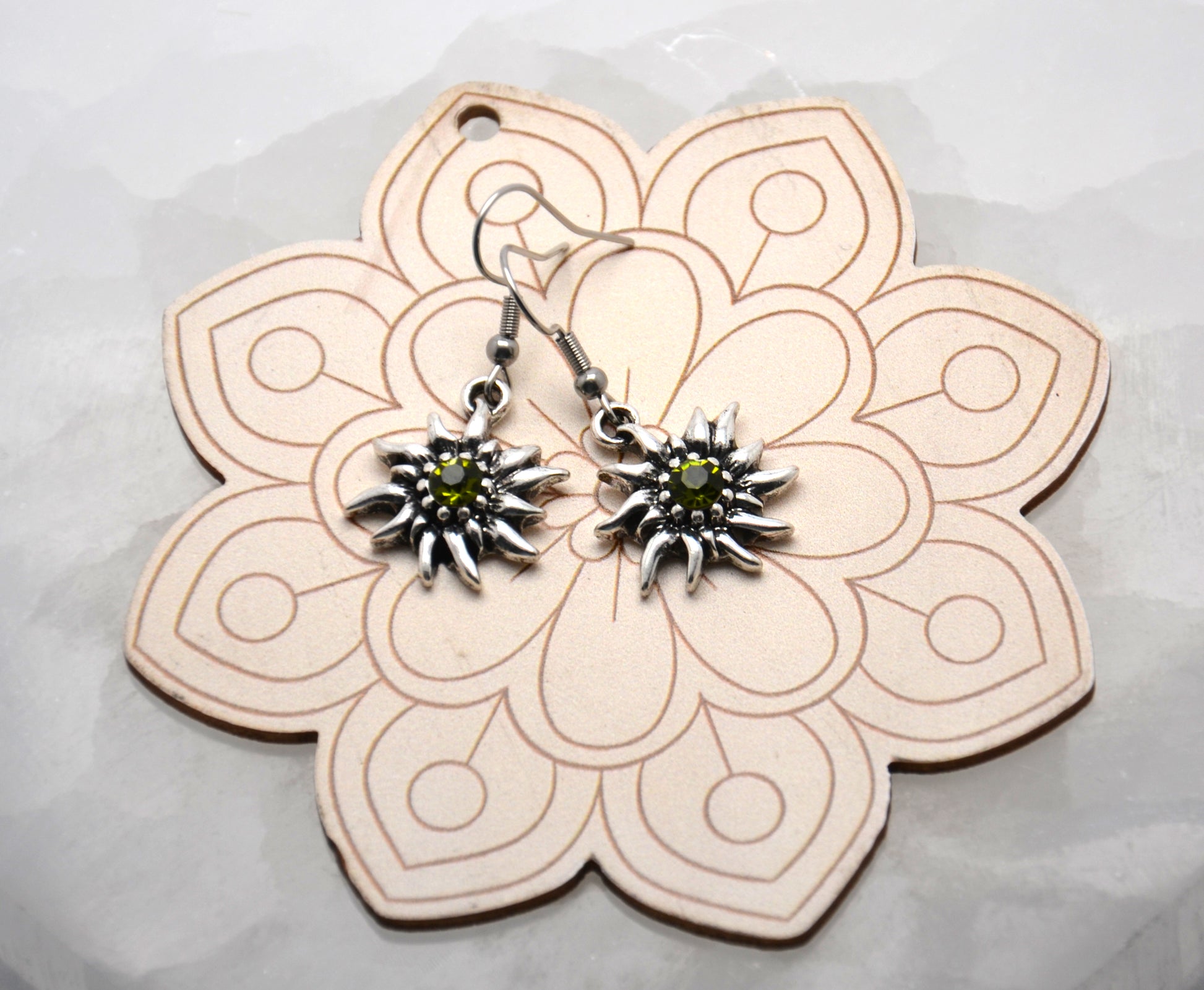 Neprehliadnuteľné náušnice, v tvare plesnivca so zeleným kameňom uprostred, sú nádherným doplnkom pre všedné aj nevšedné dni.