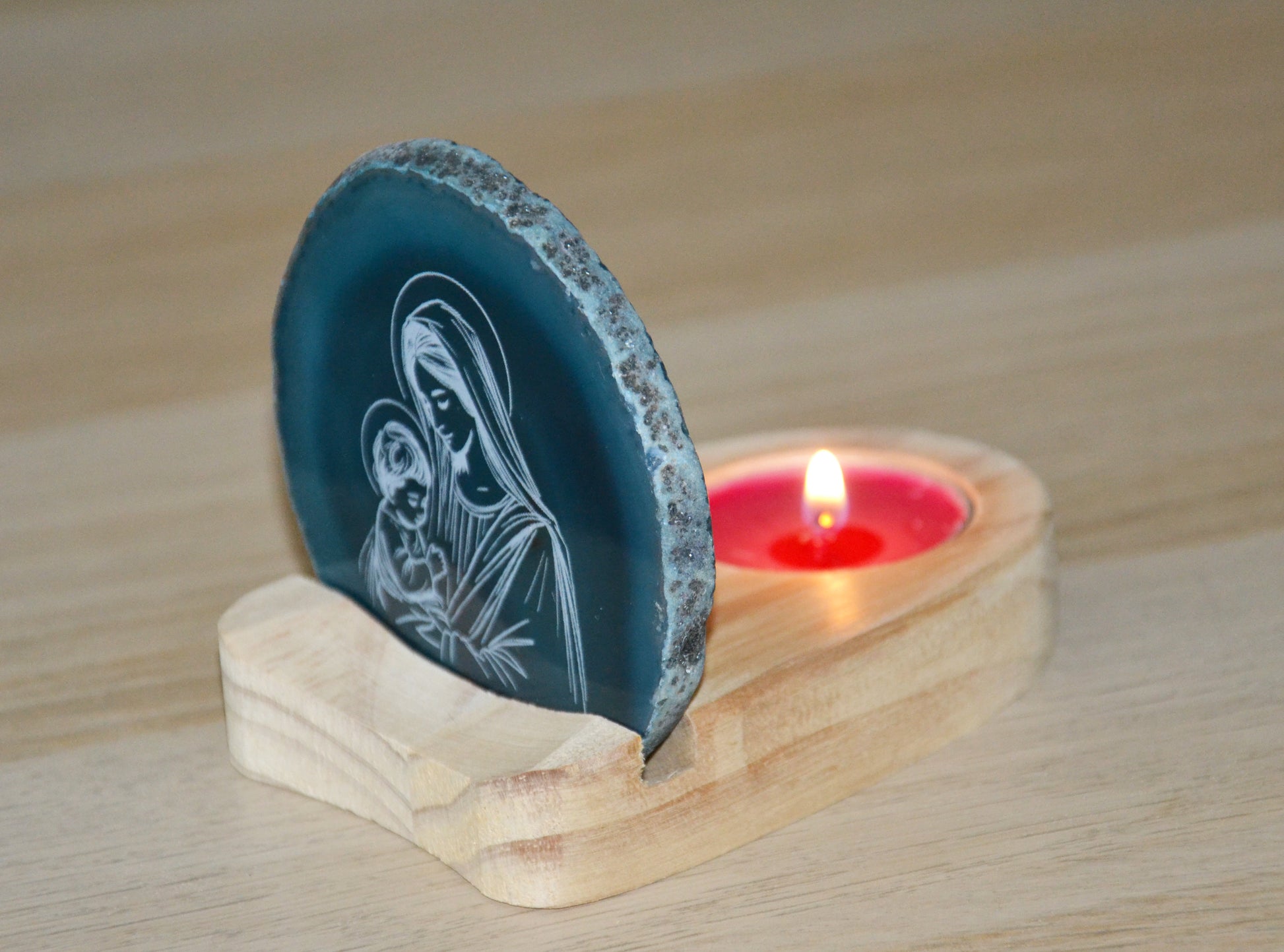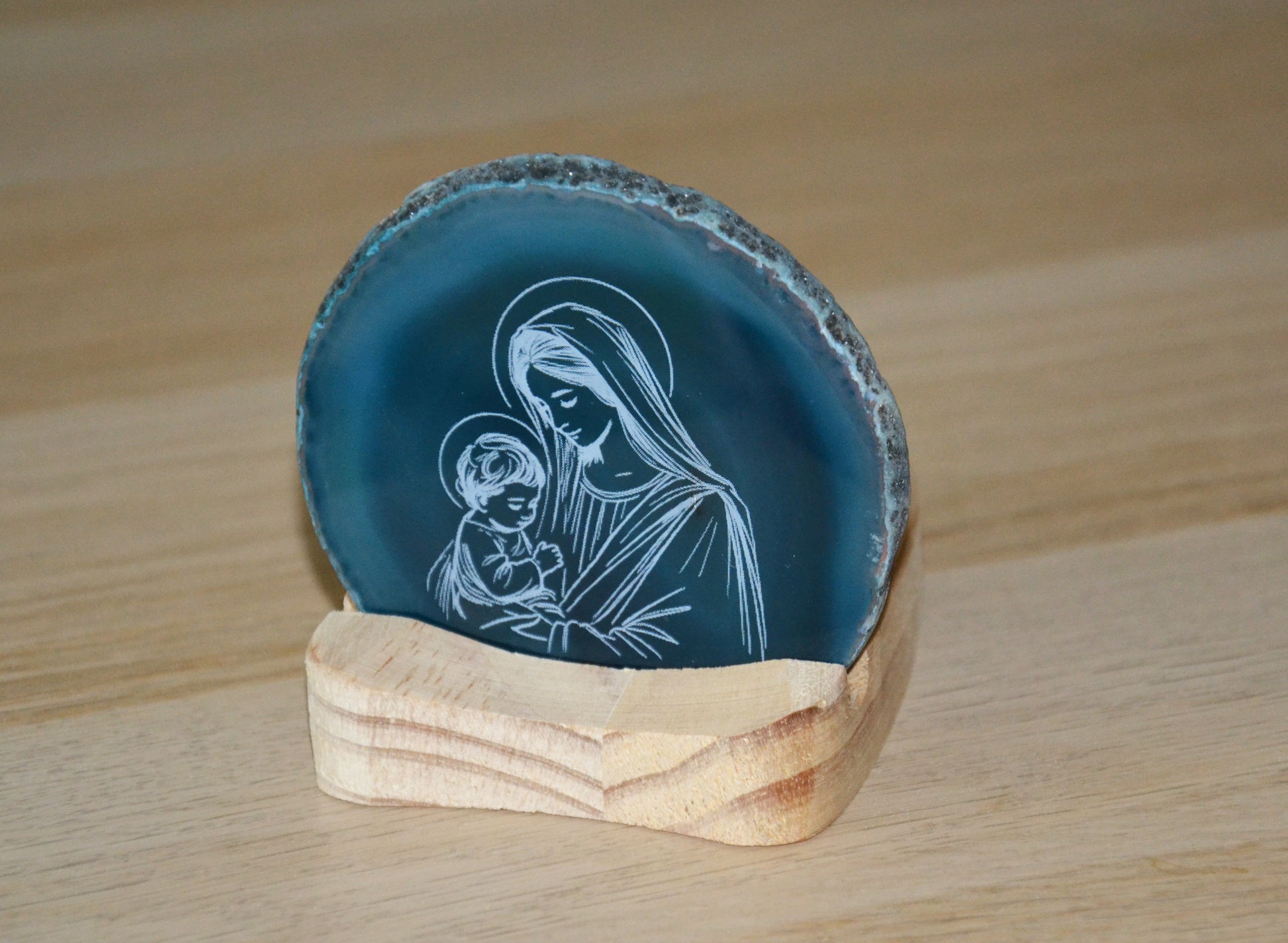 Predstavujeme Vám jedinečný klenot – nádherný gravírovaný brazílsky achát , ktorý v sebe spája prírodný kameň a hlbokú duchovnú symboliku. Tento kúsok bol s láskou a precíznosťou upravený, aby na jeho povrchu vynikol detailný a dojemný motív Panny Márie s Ježiškom .