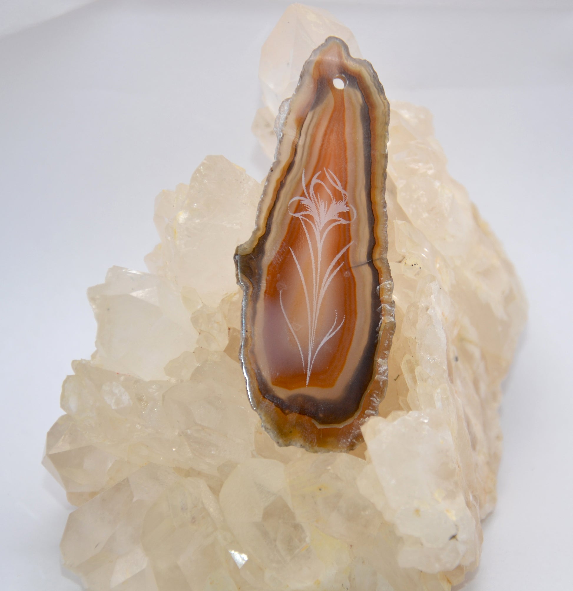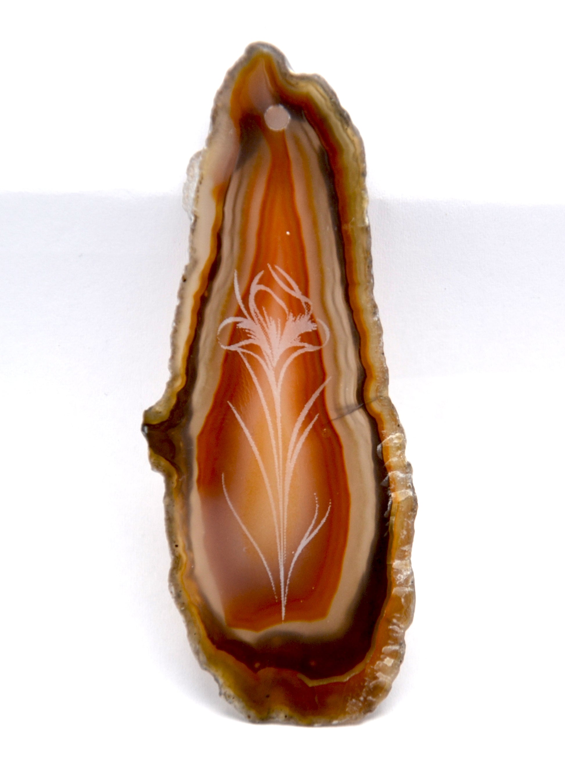 Veľmi pekný a pôsobivý prívesok je tvorený z prírodného achátu s gravírovaným motívom kvetu Iris.