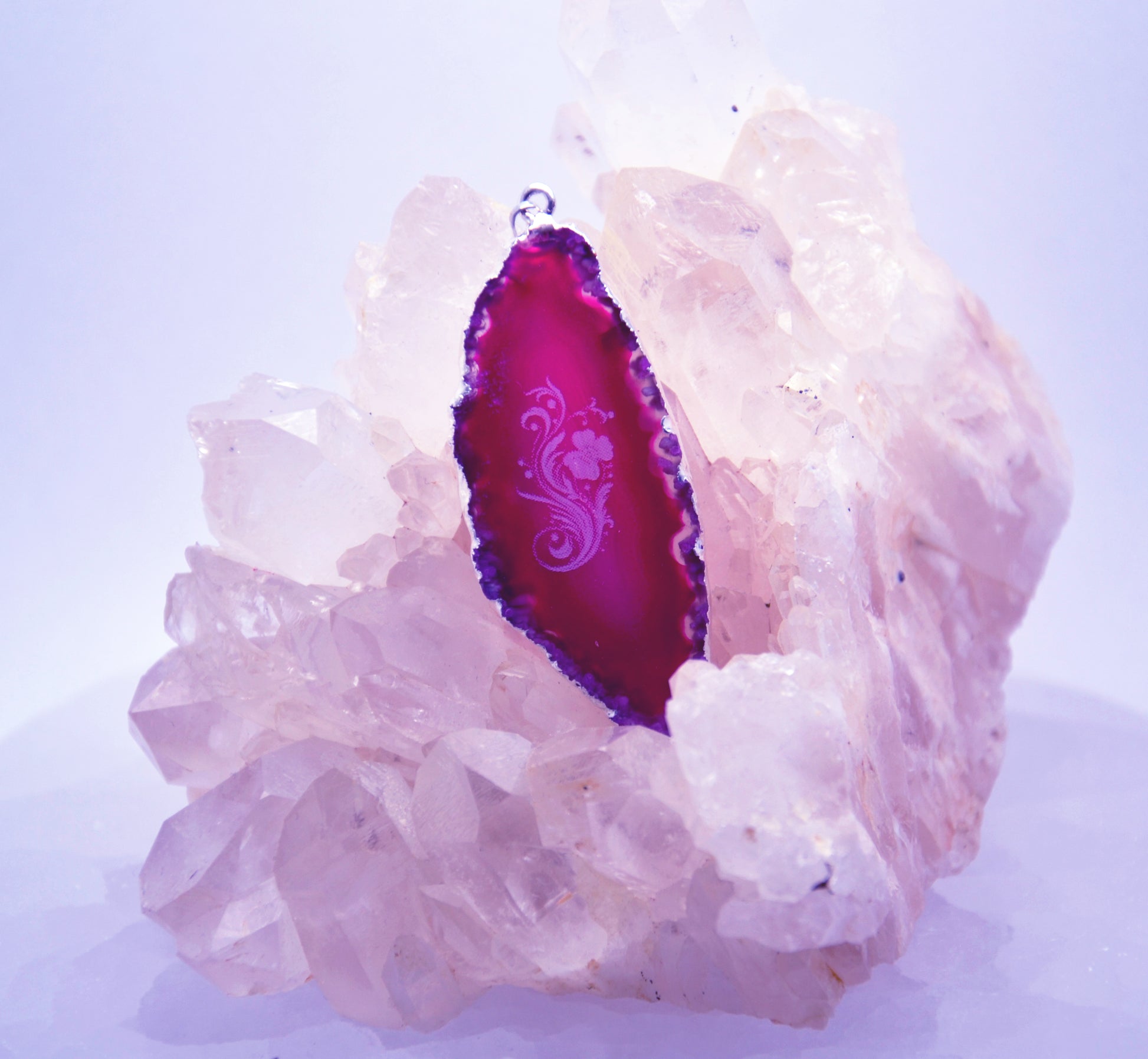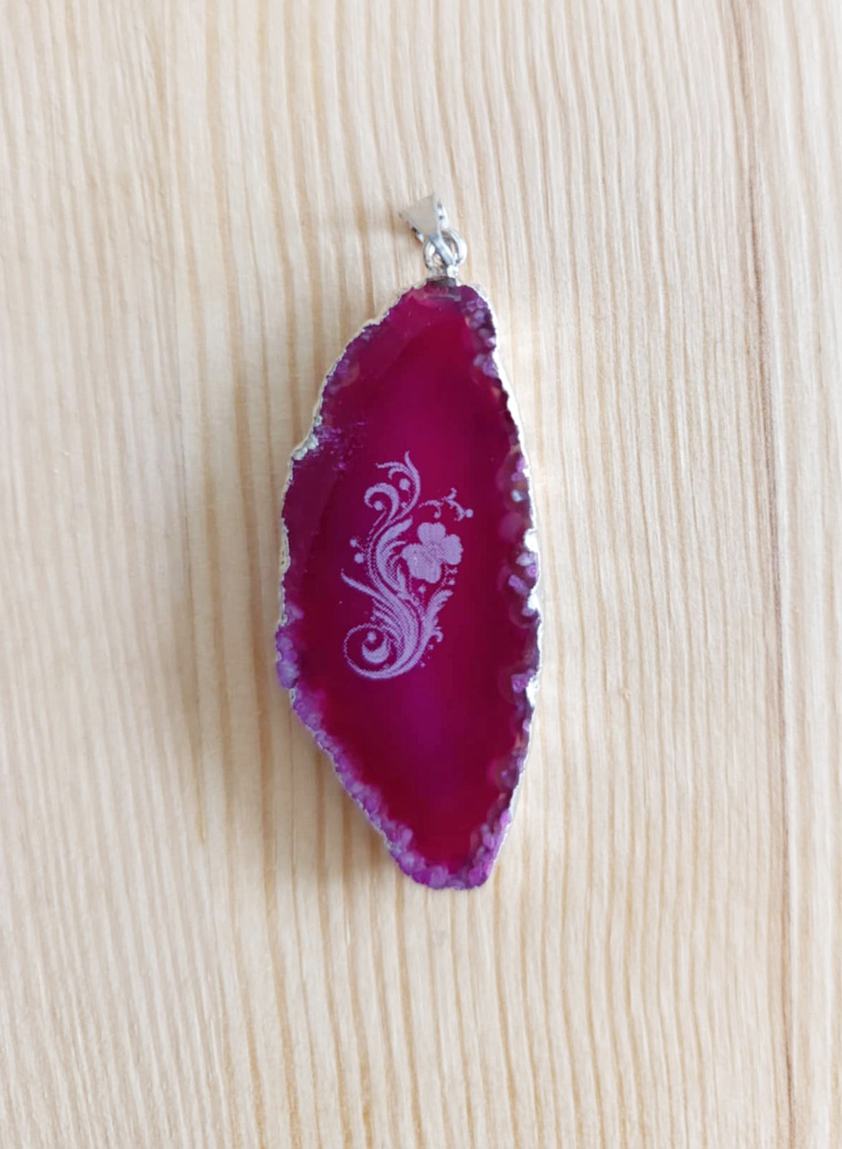 Pôsobivý prívesok z prírodného farbeného achátu nesie gravírovaný motív kvietku.