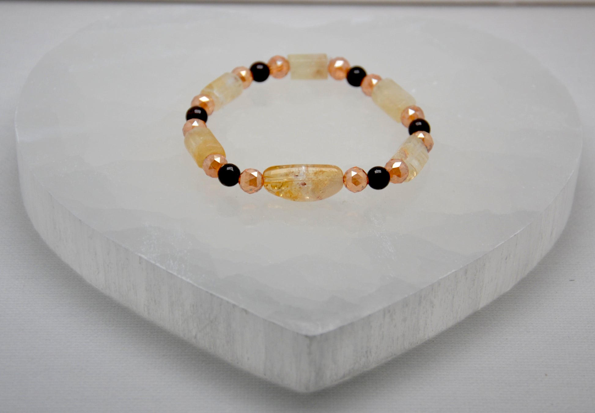 Objavte náramok, ktorý v sebe spája slnečnú energiu citrínu, ochrannú silu ónyxu a jemný lesk sklenených korálikov vo farbe champagne. Je to dokonalý šperk pre každého, kto hľadá rovnováhu medzi eleganciou a prírodou.